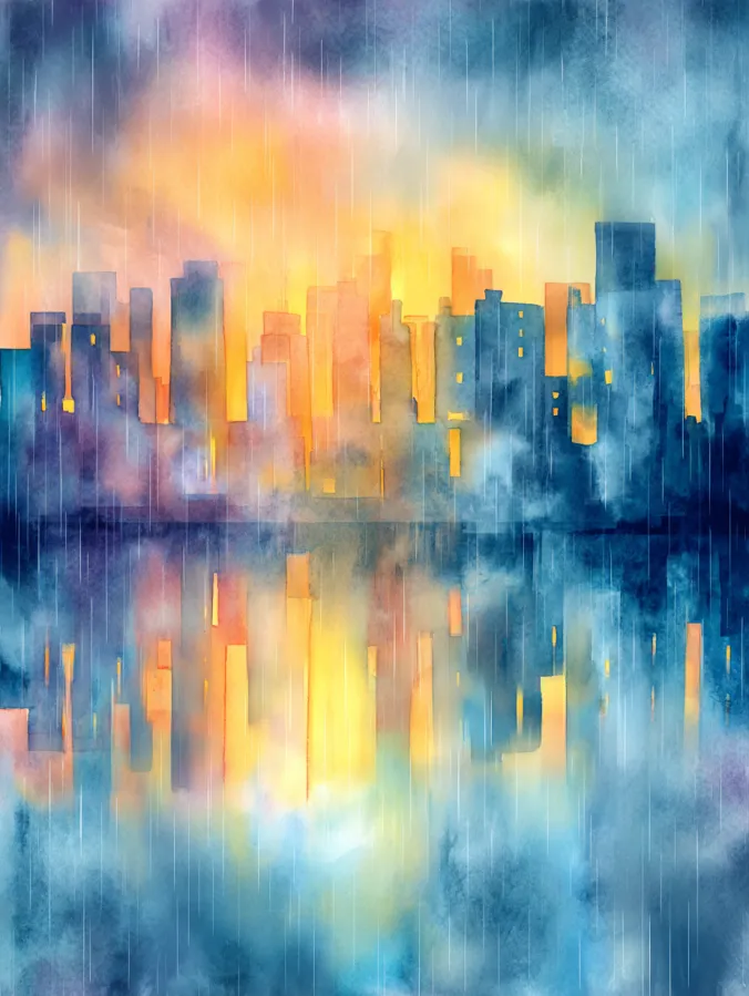This watercolor painting shows a soft city skyline glowing through rain and mist, painted in rich blues and warm golden yellows. The buildings are simple vertical shapes with loose edges, letting the colors blur slightly as if seen through falling rain. Gentle vertical brush strokes suggest rainfall, while reflections shimmer below in watery blends of light and color. The composition feels balanced and calm, with the warm center glow drawing your eye and cooler tones framing the scene.