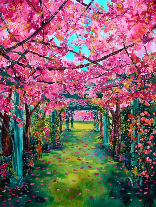 This watercolor painting captures a dreamy garden tunnel covered in vibrant pink cherry blossoms, forming a natural arch overhead. The pathway glows in fresh spring greens, dotted with scattered petals that lead the eye gently into the distance. Deep teal shadows frame the sides, while layered branches and clustered blooms create a rich canopy effect. The brush strokes feel loose yet intentional, with soft blends in the sky peeking through the blossoms and subtle texture in the foliage that makes the entire scene feel alive.