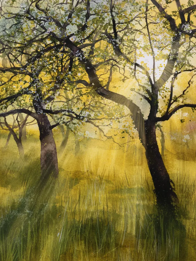 I love how peaceful this one feels. Painting light streaming through trees is such a fun challenge, and layering transparent washes to create that glow is incredibly satisfying. It is the kind of scene that makes me pause and just breathe while I paint.