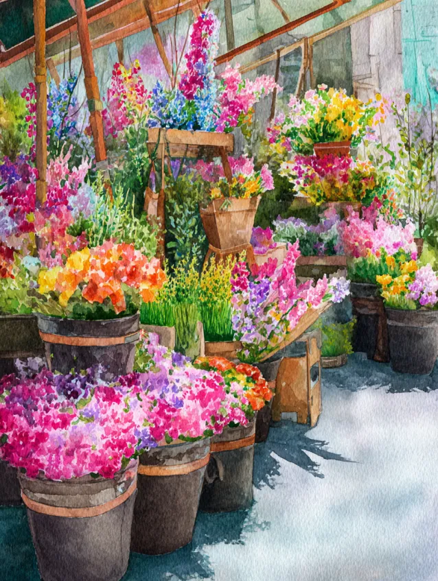 This watercolor scene captures the inside of a bright greenhouse packed with colorful flowers in layered rows. Hanging plants and potted blooms fill the space, while sunlight streams in through glass panels above, casting warm highlights on the wooden floor. The perspective draws the eye inward, making the space feel welcoming and abundant.