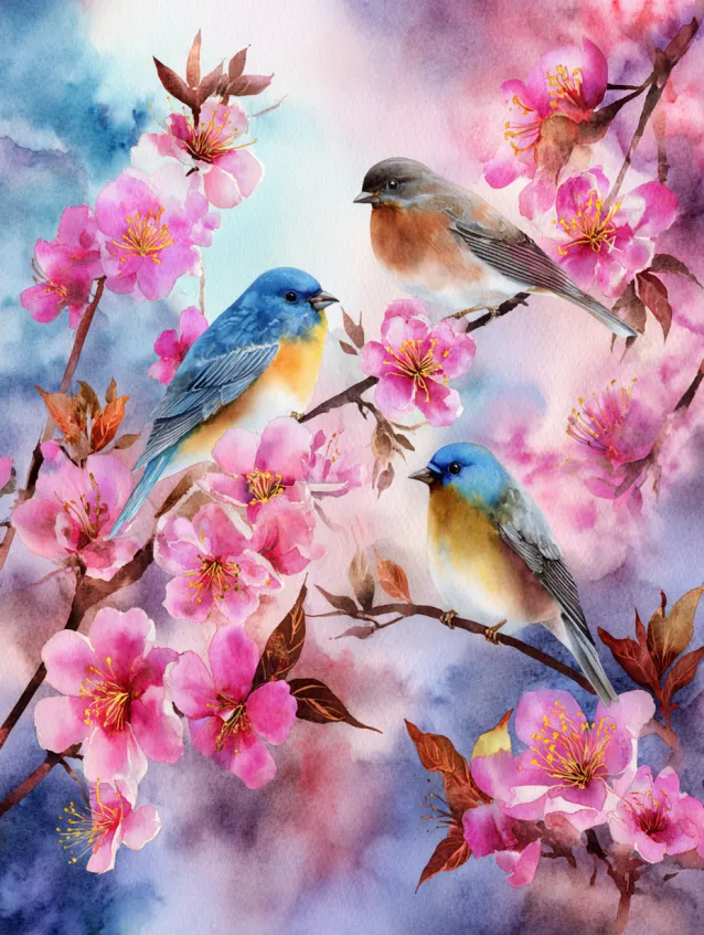 This sweet watercolor scene features two small bluebirds perched among soft pink cherry blossoms. The branches weave across the composition, creating a gentle diagonal flow. The background is a smooth blend of pastel sky tones that keeps the focus on the birds and blooms. Fine feather details contrast beautifully with the loose floral strokes.