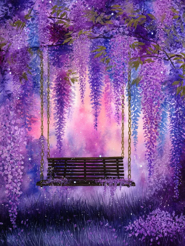This watercolor painting feels like stepping into a fairytale garden at twilight. Cascading wisteria in rich purples and soft lilacs drape from above, framing a simple wooden swing that hangs quietly in the center. The background melts from deep violet into glowing pinks, creating a dreamy haze that makes the entire scene feel soft and romantic. The brush strokes are layered and fluid, especially in the hanging blooms, giving the impression of gentle movement and depth.