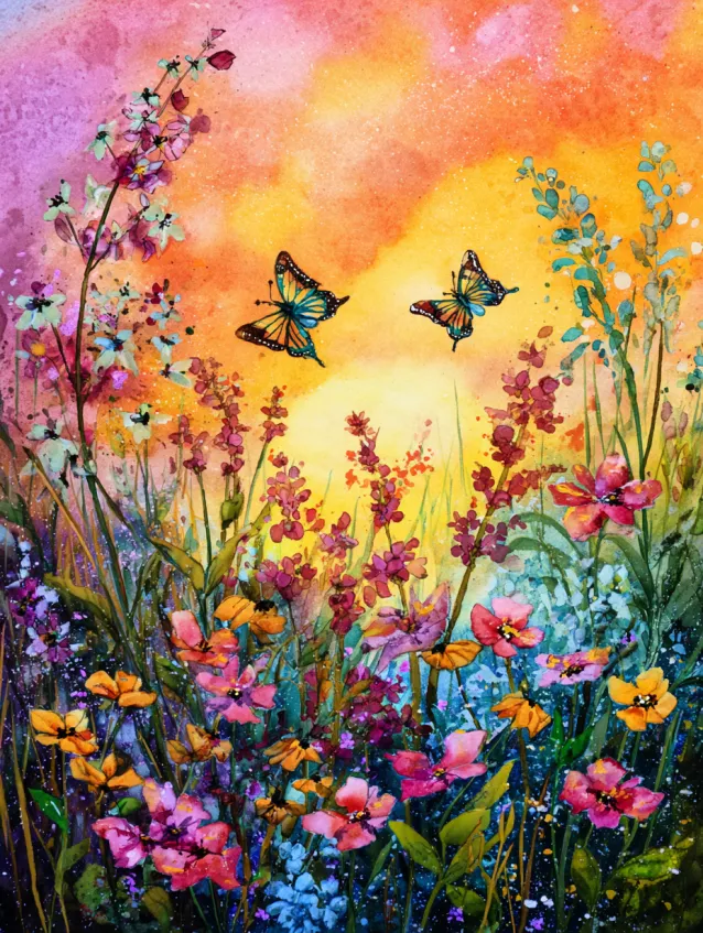 This watercolor scene bursts with warm sunset tones, shifting from golden yellow to fiery orange in the sky. In the foreground, a lively mix of pink, coral, and blue wildflowers stretch upward, painted with loose yet detailed strokes. Two butterflies flutter near the top, adding motion and balance to the vertical composition. The layered flowers create fullness while the glowing sky keeps everything vibrant and uplifting.