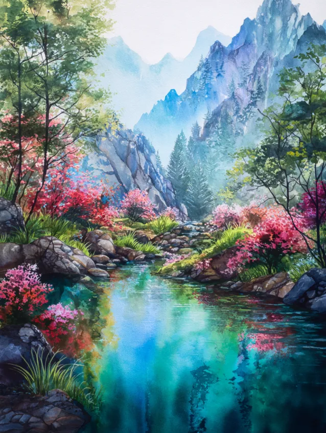 This watercolor landscape features a serene river reflecting turquoise and emerald tones as it winds through a lush valley. Pink flowering trees line the banks, while tall mountains rise softly in the background with misty blue peaks. The water has gentle reflections that mirror the blossoms and sky, adding gorgeous depth to the composition. The contrast between cool water and warm florals makes the whole scene feel balanced and refreshing.