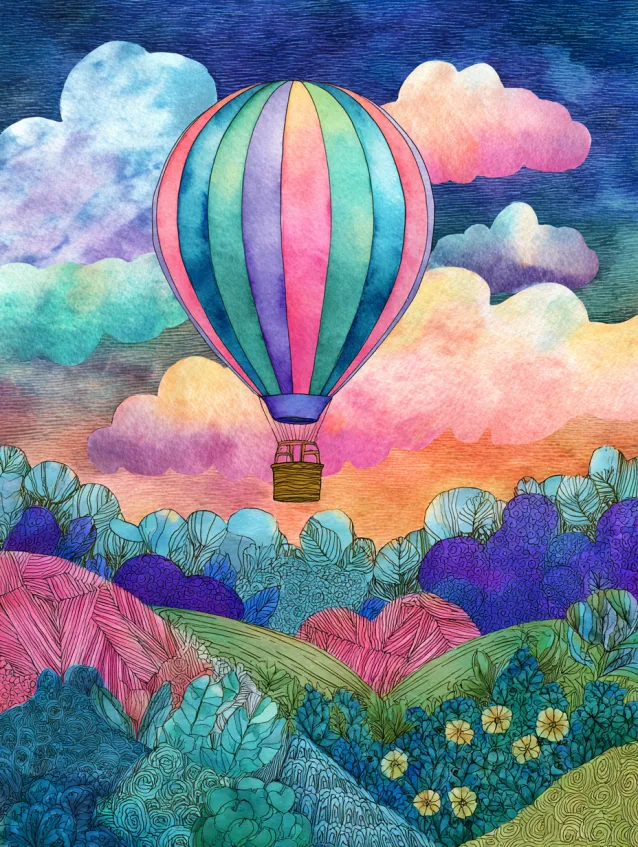 This playful watercolor design shows a rainbow striped hot air balloon floating above rolling hills covered in stylized spring blooms. The clouds are fluffy and pastel toned, and the sky shifts from soft pink to dreamy blue. The hills are layered in rounded shapes with pops of florals scattered throughout, giving the entire piece a cheerful, storybook feel.