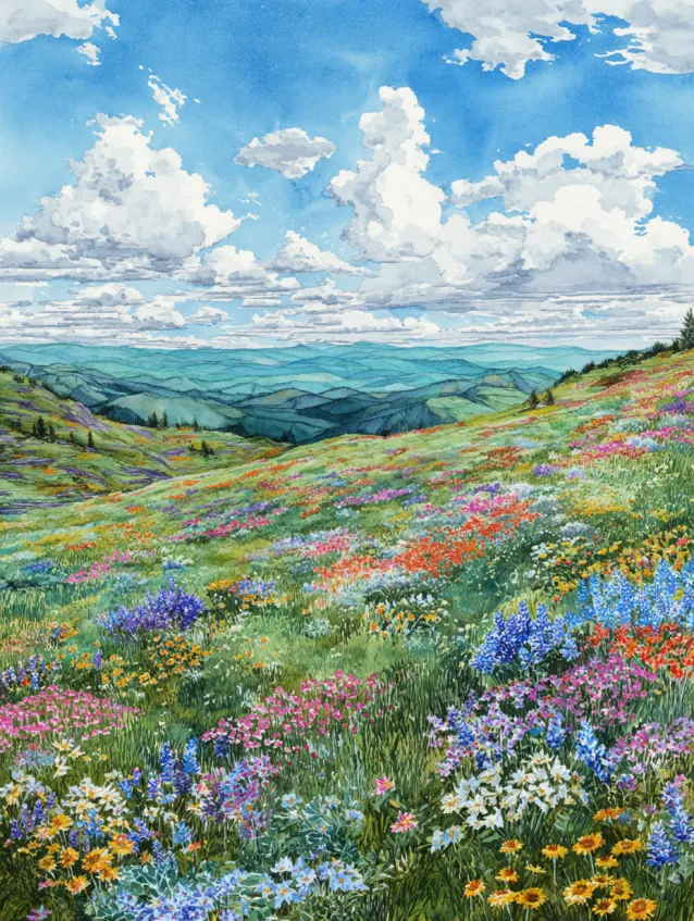 This watercolor painting captures a sweeping meadow filled with tiny spring blooms in pinks, yellows, and blues stretching toward distant hills. A bright blue sky with fluffy white clouds fills the top half of the composition, creating an airy open feel. The brushwork in the grass is loose and layered, giving texture without overpowering the delicate flowers.