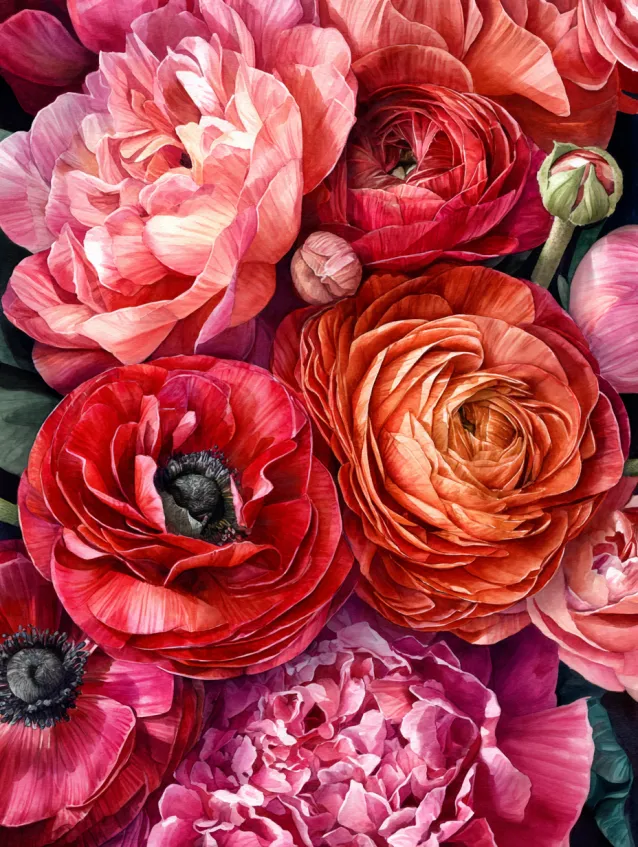 This watercolor piece zooms in on oversized spring blooms in rich coral, blush pink, and deep red tones. The petals are layered with careful shading, creating depth and softness at the same time. Darker accents in the flower centers add contrast, while subtle hints of green leaves peek through the tightly framed composition. The entire canvas is filled with petals, making it bold and dramatic.