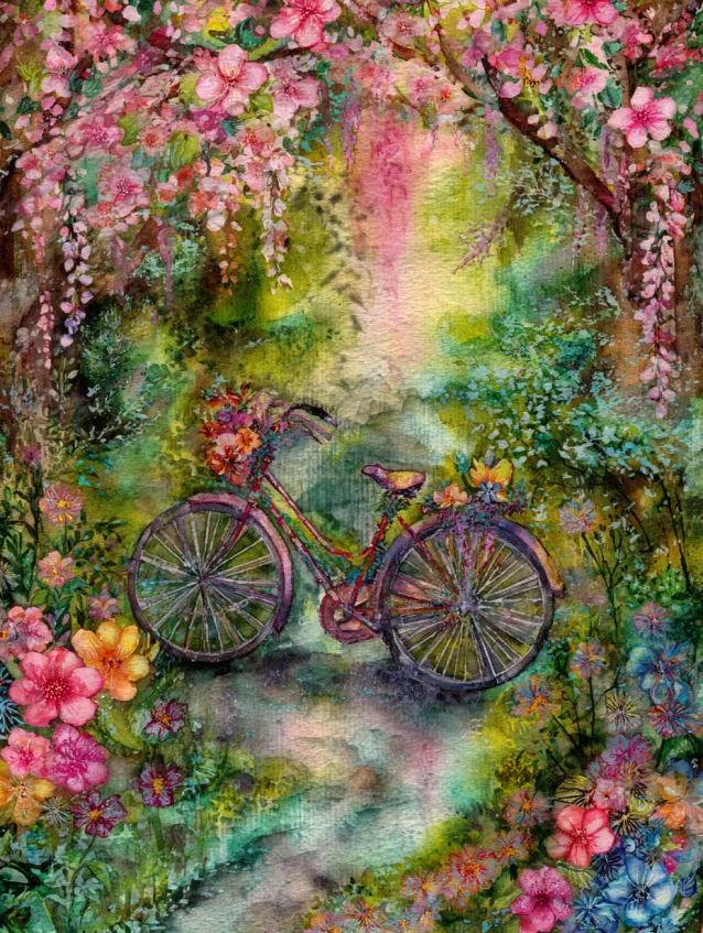 I think this one is such a fun storytelling piece. Painting all the layered flowers feels joyful, and adding the bicycle gives it personality. It reminds me of carefree spring afternoons and makes the whole process feel playful and creative.