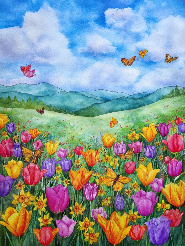 This cheerful watercolor scene bursts with rows of bold tulips in reds, yellows, pinks, and purples stretching across rolling green hills. The foreground flowers are painted with rounded, saturated petals, while soft blue mountains fade gently into the background. A bright sky with fluffy white clouds opens up the composition, and a few delicate butterflies float above the blooms, adding movement and charm. The layering from front to back creates beautiful depth without feeling too busy.