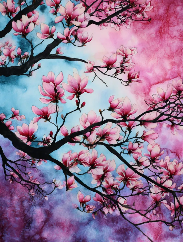 This elegant watercolor painting showcases sweeping magnolia branches covered in soft pink blossoms stretching across a glowing blue sky. The branches curve naturally through the frame, creating movement and balance. The petals are gently shaded with blush and white highlights, while the sky blends smoothly behind them for a fresh airy look.