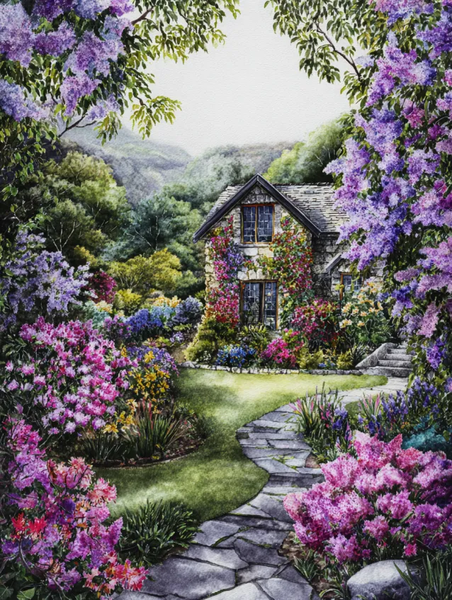 This watercolor design features a cozy little cottage tucked among lush purple and pink blossoms. A winding stone path curves gently toward the door, framed by layered shrubs and flowering trees. Soft light filters through the greenery, and the background hills fade into a hazy spring sky. The brushwork adds texture to the stone path and wooden details of the cottage, while the florals remain soft and romantic.