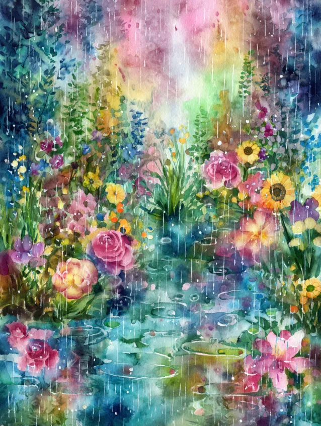 This watercolor piece leans into an abstract, painterly style with a cascade of vibrant flowers blending into a luminous, almost magical backdrop. Pinks, yellows, blues, and greens melt into one another with soft drips and organic bleeds. The flowers seem to glow from within, layered over a dreamy wash of shifting color that fills the entire frame.