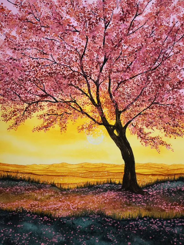 There is something so magical about painting sunsets, especially when paired with blossoms. I love building that glowing sky first and then layering the tree on top. Watching the colors interact feels like capturing a fleeting spring evening.