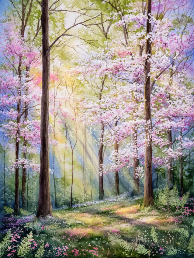 This airy watercolor scene features tall slender trees with soft pink and lavender blossoms lining a forest path. Gentle beams of light filter through the trunks, casting dappled shadows on the ground. The background fades into a misty blend of greens and golds, creating depth and a peaceful atmosphere. The vertical composition makes the trees feel elegant and graceful.