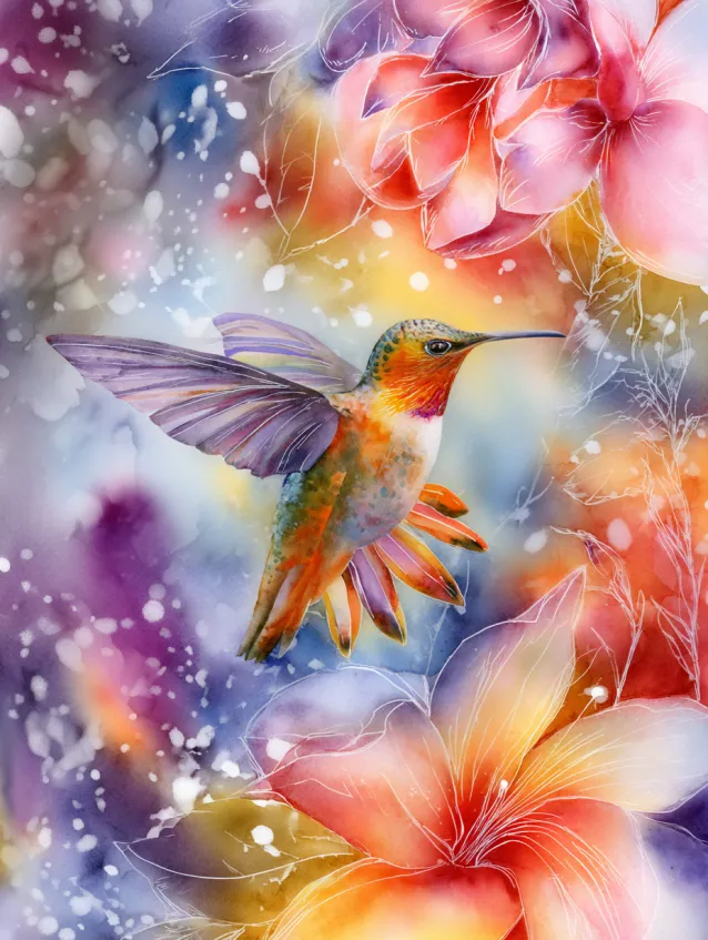 This lively watercolor painting highlights a tiny hummingbird mid flight, surrounded by large glowing flowers in coral, pink, and warm orange tones. The background is softly blended with dreamy bokeh like dots and sparkles, giving the scene a whimsical glow. The bird’s wings are slightly blurred with fluid strokes to suggest motion.