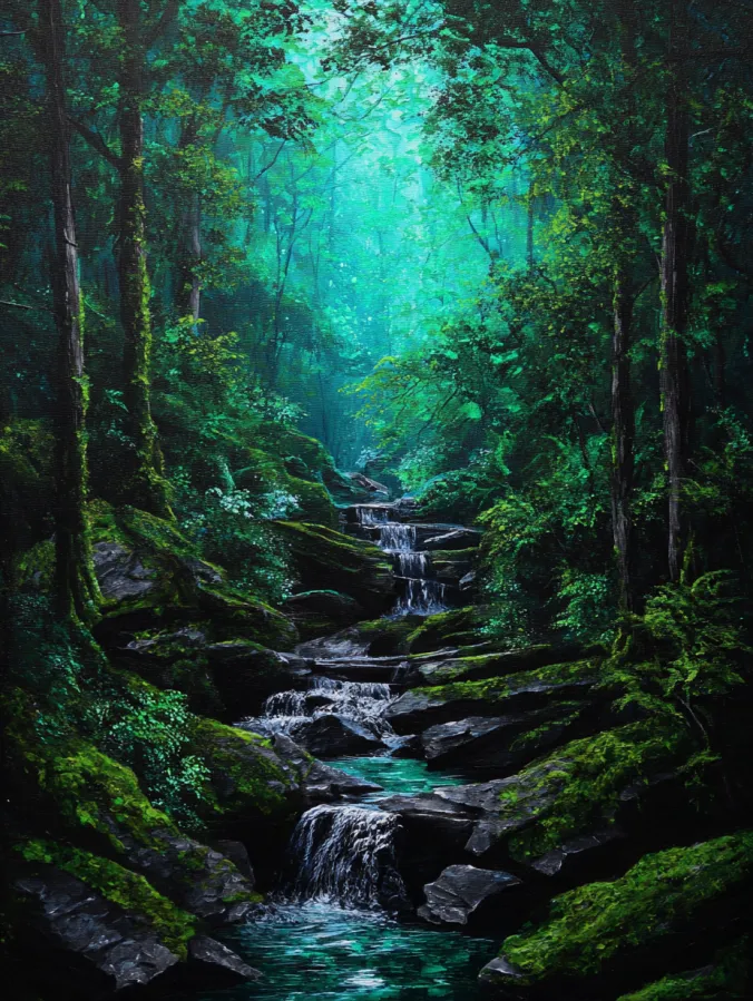 A series of gentle waterfalls flows down mossy rocks deep within a lush green forest. Tall trees frame the scene on both sides and their leafy canopy creates a soft glowing light that filters through the upper part of the painting. Rich shades of emerald, teal, and deep forest green fill the landscape while the dark stone steps of the waterfall add structure and contrast. The water cascades gracefully from one rocky ledge to the next and gathers in small pools that shimmer with cool turquoise reflections. Textured acrylic brush strokes bring life to the moss and foliage while smoother strokes capture the flowing movement of the water.