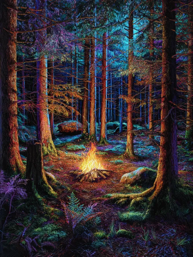 A small glowing campfire sits at the center of a quiet forest clearing surrounded by tall pine trees. Warm golden flames flicker upward and cast soft orange light across the forest floor while deep blues and rich purples fill the surrounding shadows. The tall tree trunks rise straight into the dark canopy and create a beautiful contrast between the warm firelight and the cool night tones. Mossy ground, scattered rocks, and delicate ferns add texture and detail around the clearing. Acrylic brush strokes appear layered and vibrant which gives the bark, plants, and forest floor a lively texture while the fire itself glows brightly in the center.