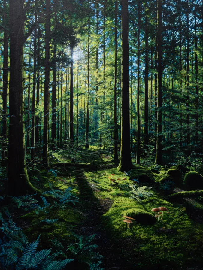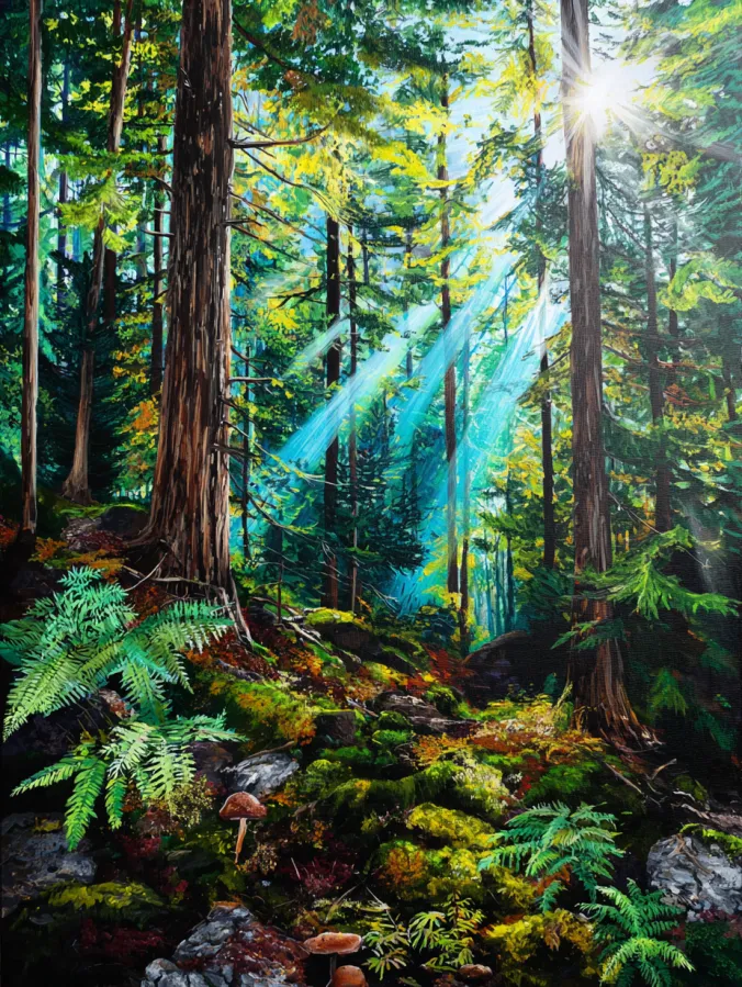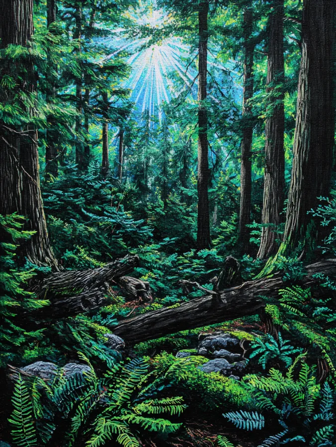 I always enjoy painting scenes like this because the sunlight adds such a beautiful sense of energy to the forest. Watching the rays slowly appear across the canvas is one of my favorite parts of the process. I also love adding the layers of ferns and moss since it makes the forest feel full and cozy. If you enjoy nature paintings with rich textures and glowing natural light, this kind of woodland scene is incredibly fun and relaxing to create.