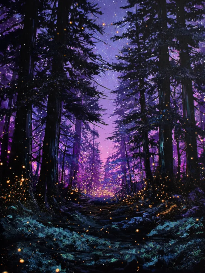 Tall dark pine trees rise along both sides of a winding forest path and create a dramatic nighttime woodland scene. The sky glows with dreamy shades of lavender, deep violet, and soft pink that fade gently through the distant trees. Tiny golden fireflies float through the air and scatter glowing specks of light across the forest floor and branches. The path leads quietly into the glowing distance which gives the composition a sense of mystery and depth. Rich acrylic brush strokes shape the tree trunks and textured ground while the background colors blend smoothly to create a magical twilight atmosphere.