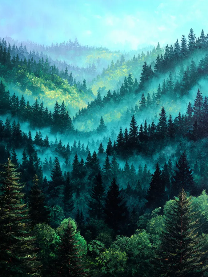 Rolling hills covered in dense evergreen trees stretch across the canvas and create a peaceful layered forest landscape. Soft mist drifts through the valleys and wraps around the pine covered slopes which adds a dreamy sense of depth to the scene. Cool shades of teal, jade, and deep forest green blend beautifully with lighter touches of pale turquoise and soft morning light. The distant hills fade gently into the hazy sky while the darker trees in the foreground create strong contrast and structure. Smooth acrylic blending captures the foggy atmosphere while textured brush strokes bring life to the clusters of trees scattered across the hills.