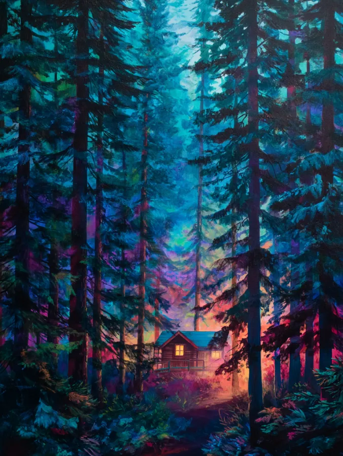 Tall evergreen trees stretch upward and frame a glowing woodland cabin tucked deep within the forest. The scene is painted with rich layers of teal, emerald, and deep pine green that blend beautifully with soft purples and hints of warm coral light near the ground. The little wooden cabin glows warmly with golden window light that contrasts against the cool forest tones. Loose yet textured acrylic brush strokes shape the towering trees while softer blended layers create a dreamy mist that fills the background. The composition naturally draws the eye down the forest path toward the cozy cabin, making the whole painting feel inviting and peaceful.