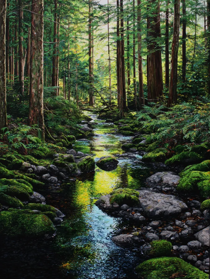 A gentle creek winds through a lush woodland and creates a peaceful scene filled with rich forest textures. Tall pine trees rise along both sides of the water while sunlight filters through the canopy and glows across the surface of the stream. Smooth stones and moss covered rocks line the creek bed and guide the water as it curves softly through the forest. The painting is filled with deep greens, earthy browns, and soft golden reflections that shimmer in the flowing water. Acrylic brush strokes bring beautiful texture to the bark, moss, and foliage while the water is painted with smooth reflective strokes that capture the light.