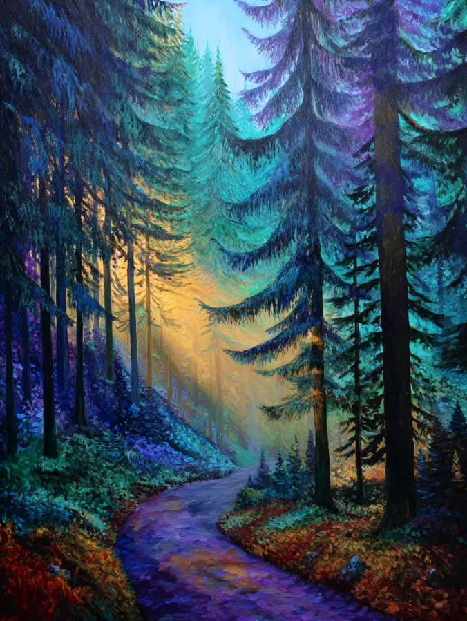 A narrow forest road curves gently through tall pine trees and leads the viewer deep into a glowing woodland landscape. The trees rise high above the path with sweeping branches that create a soft canopy overhead. Vibrant colors flow throughout the painting with cool turquoise, deep violet, and rich forest green blending beautifully across the trees and hillside. Warm golden light glows in the distance and fills the center of the scene with a soft sunset haze. Acrylic brush strokes appear bold and painterly which adds lively texture to the foliage and tree trunks while the winding road guides the composition forward.