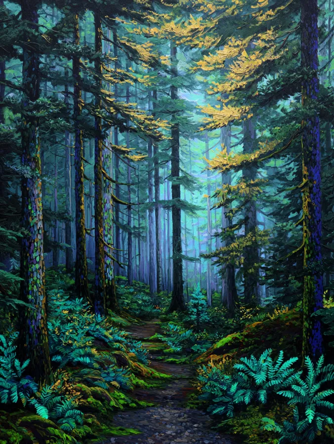 Tall evergreen trees stretch high across the canvas and create a layered woodland scene full of depth and quiet beauty. A narrow dirt path winds gently through thick ferns and mossy ground, guiding the eye toward the misty forest in the distance. Rich shades of emerald, teal, and deep forest green dominate the painting while soft golden highlights shimmer across the upper branches where sunlight filters through the canopy. The acrylic brush strokes feel textured and lively, especially along the bark and leafy undergrowth, while the hazy background trees create a dreamy sense of distance and calm.