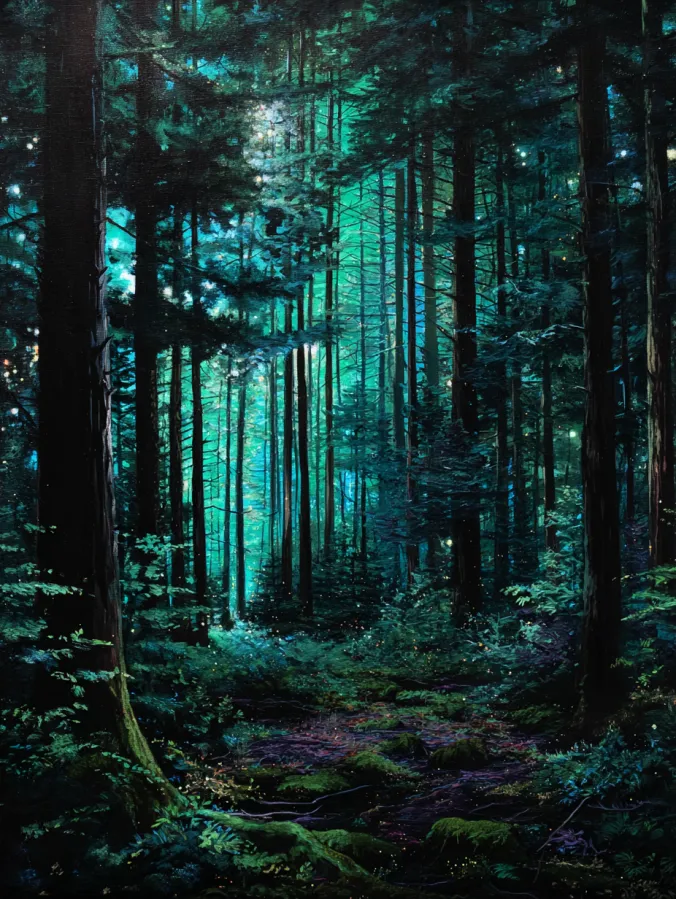 Tall slender tree trunks stretch upward and create a deep layered woodland scene that feels mysterious and magical. The forest glows with rich shades of teal, emerald, and deep midnight green while soft turquoise light filters through the distant trees. Dark silhouettes of pine trunks frame the composition and guide the eye toward the luminous center of the forest. The forest floor is filled with textured moss, shadowy plants, and hints of glowing specks that feel like tiny fireflies scattered through the air. Acrylic brush strokes appear bold and layered across the bark and foliage while softer blended areas create the dreamy glowing atmosphere in the background.