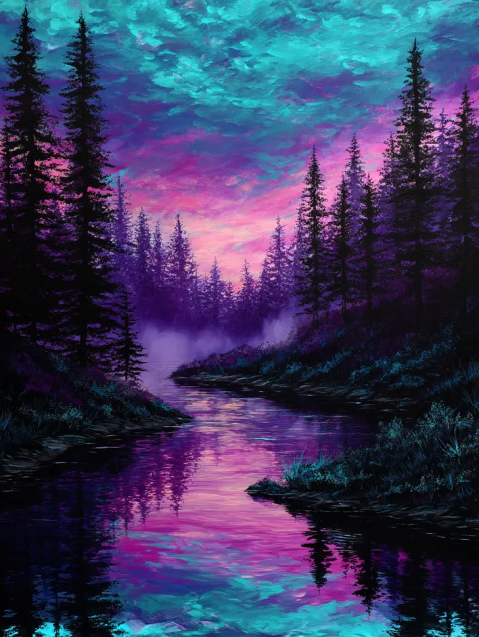 Tall pine silhouettes frame a glowing river that winds gently through the forest. The sky bursts with vivid shades of turquoise, magenta, and soft lavender that blend across thick textured clouds. Those rich colors reflect beautifully in the calm water below and create a mirror like ribbon of color that leads the eye deep into the scene. Dark evergreen trees stand tall along both sides of the river and add contrast against the luminous sky. Loose acrylic brush strokes give the clouds a soft painterly texture while deeper layered tones shape the grassy banks and shadowy forest edges.