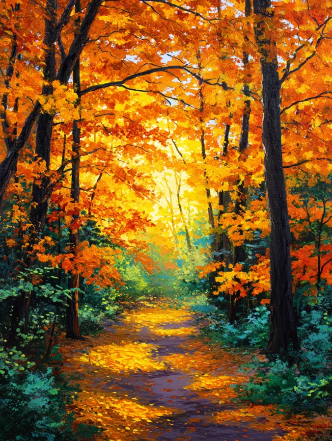 A winding forest path stretches gently through tall trees bursting with brilliant autumn color. The canopy above glows with rich shades of orange, amber, and golden yellow while dark tree trunks create strong vertical contrast throughout the scene. Warm sunlight shines through the leaves and casts glowing patches of light along the earthy trail below. The forest floor is scattered with fallen leaves that echo the vibrant colors above and guide the eye deeper into the woodland. Textured acrylic brush strokes bring the foliage to life and create a lively layered canopy that feels full and radiant.