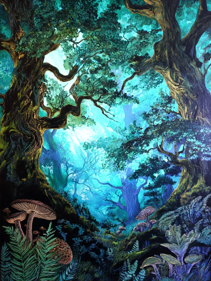 Large twisting tree trunks frame the scene and create a magical woodland setting that feels almost like a storybook forest. Their branches curve and stretch across the canvas with textured bark painted in deep browns and soft mossy greens. The background glows with cool turquoise and misty blue tones where soft rays of light filter through the dense canopy. The forest floor is filled with layered plants, ferns, and delicate mushrooms that add charming detail and depth near the front of the composition. Acrylic brush strokes give the leaves a lively clustered texture while the soft glowing background adds a dreamy atmosphere.