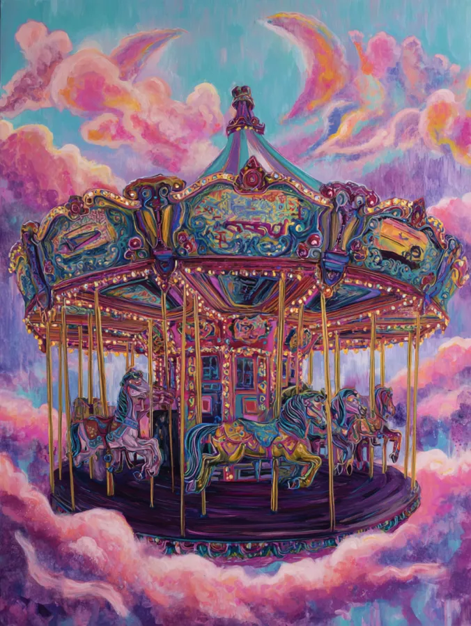This acrylic painting shows a whimsical carousel drifting through a sky filled with soft pink and peach clouds. The carousel sits right in the center and feels almost magical as it floats among pastel skies. Each carousel horse is painted in playful shades of teal, lavender, and warm gold. The ornate roof is packed with swirling decorative patterns and glowing lights that give it a storybook charm. Fluffy clouds wrap around the base while curved streaks of color sweep across the sky like dreamy wind trails. Visible brush strokes and thick layered paint add texture across the canvas which makes the colors feel rich and alive.