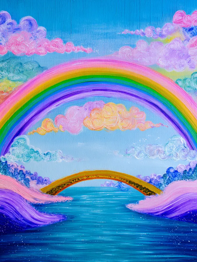 This acrylic painting shows a soft pastel landscape with a glowing rainbow stretching across a peaceful sky. The rainbow arches high above gentle pink clouds and flows down toward a golden bridge that crosses calm blue water. Fluffy clouds swirl across the sky in shades of lavender, peach, and cotton candy pink. The water below reflects hints of turquoise and sky blue with soft horizontal brush strokes that suggest gentle movement. The curved rainbow and bridge create a simple focal point that pulls the whole scene together while the playful colors keep the composition light and cheerful.