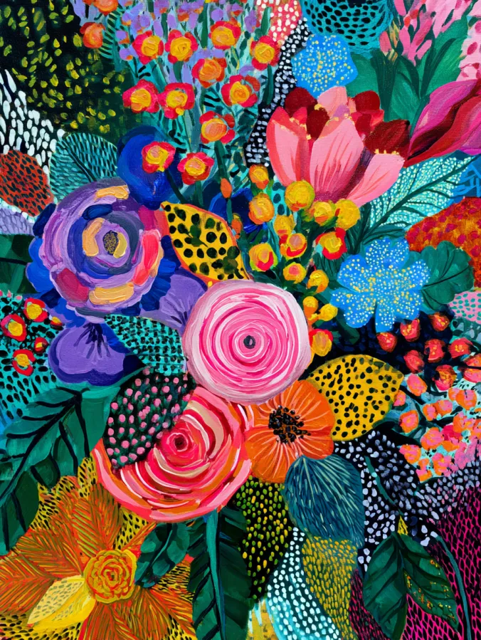 Painting something like this feels incredibly freeing. I love how abstract florals allow me to play with color without worrying about making flowers look realistic. I can experiment with patterns, dots, and layered brush strokes wherever the mood takes me. Each flower can be completely different which keeps the process fun from start to finish. By the time the canvas is filled with color it feels energetic and joyful which makes it such a cheerful piece to display.