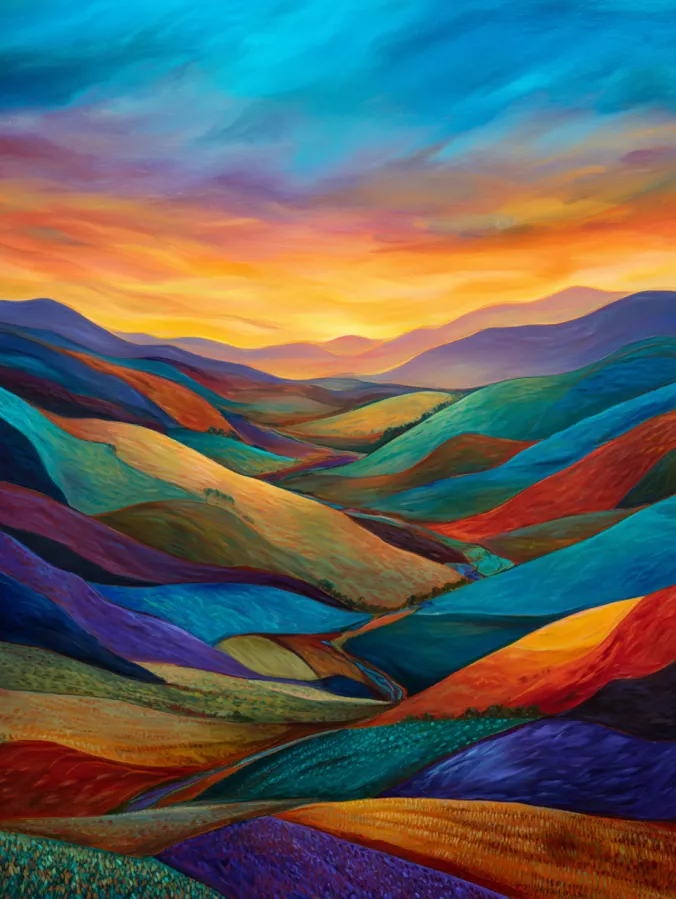 This acrylic painting shows a wide valley of rolling hills stretching toward a glowing sunset sky. Each hill is painted in bold unexpected colors like turquoise, violet, crimson, and warm gold which gives the landscape a playful artistic twist. The hills curve gently across the canvas and lead the eye toward distant mountains along the horizon. Above them the sky glows with soft blends of orange, peach, and blue that melt together in smooth sweeping brush strokes. The layered hills create depth while the vibrant colors make the entire scene feel lively and full of energy.