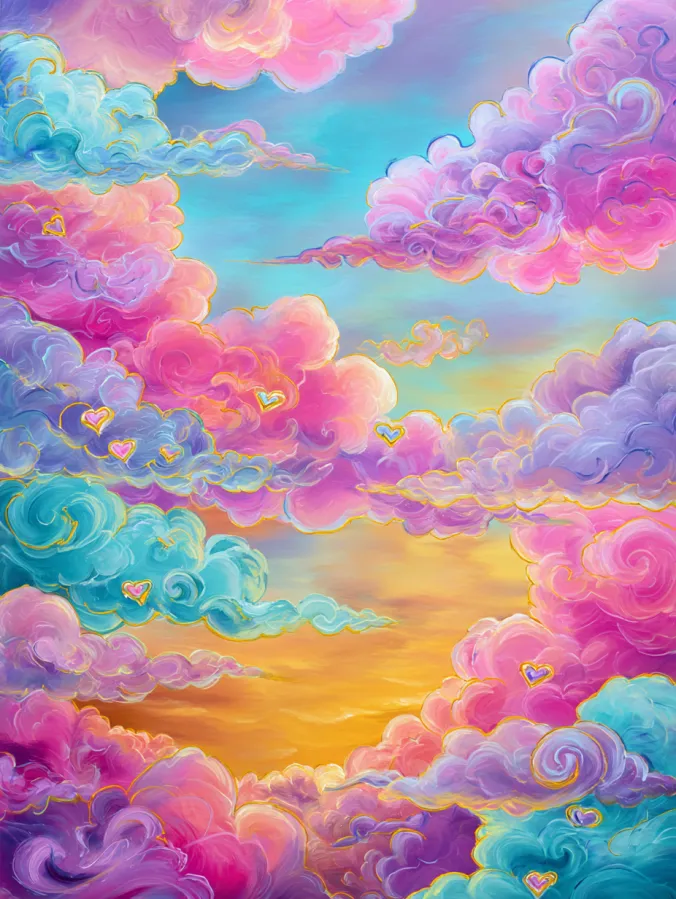 This acrylic painting shows a sky filled with soft swirling clouds in bright pastel colors. Puffy clouds in shades of pink, lavender, turquoise, and peach float across a glowing sunset sky. Gentle curls of paint form playful spirals inside the clouds which gives the scene a dreamy storybook feeling. Small golden heart shapes are tucked into the clouds which add a sweet whimsical touch. The sky in the center glows with warm light while the colorful clouds frame the scene from every side. The brush strokes are soft and flowing which makes the clouds look fluffy and full of movement.