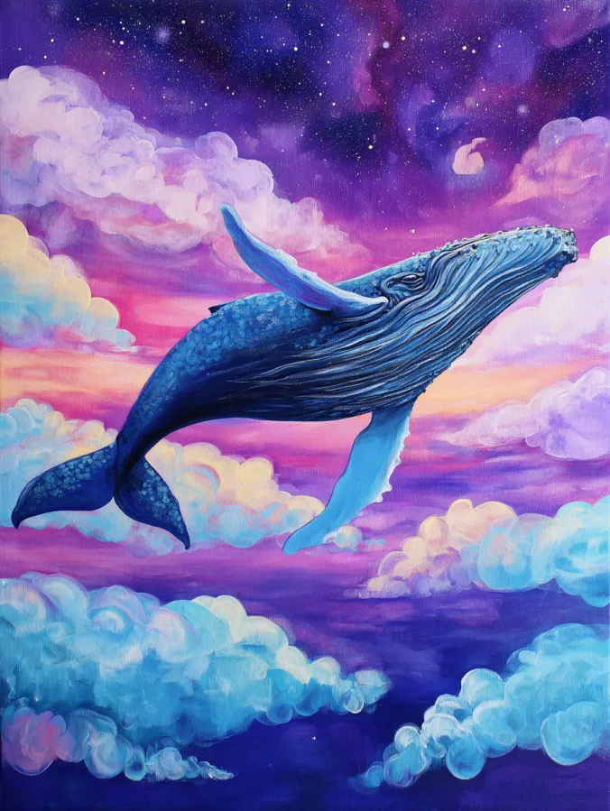 Painting a scene like this feels wonderfully imaginative. I love how the idea mixes ocean life with a dreamy night sky which makes the whole painting feel playful and unique. The whale is fun to paint because the large shape allows for smooth blending and soft highlights. The clouds and stars add even more chances to experiment with color and texture. By the time everything comes together the painting feels peaceful and whimsical which makes it such a charming piece to display.