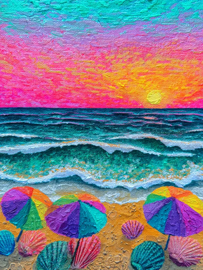 This acrylic painting shows a vibrant beach scene glowing under a bold sunset sky. The horizon glows with warm shades of pink, coral, and golden yellow as the sun sinks toward the ocean. Rolling waves in teal and turquoise move toward the shore with thick textured brush strokes that give the water a lively rhythm. In the foreground bright beach umbrellas in rainbow colors sit among scattered seashells on warm sandy tones. The sky, water, and sand all show visible textured layers of paint which give the entire scene a rich handcrafted feel.