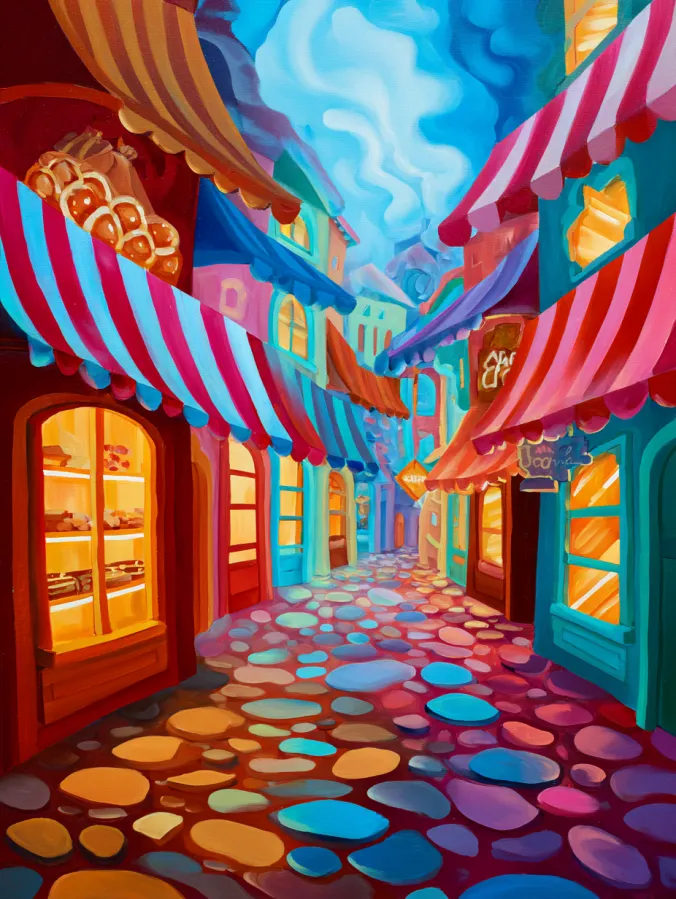 This acrylic painting shows a charming little street lined with colorful shops and playful striped awnings. The buildings lean gently toward the narrow cobblestone path which leads the eye through the center of the scene. Warm golden light glows from the shop windows and adds a cozy feeling to the bright surroundings. The awnings are painted in bold stripes of red, pink, teal, and cream which create a lively rhythm across the street. The cobblestones below are scattered in rounded shapes with shades of blue, coral, lavender, and amber. Soft painterly brush strokes and smooth color blends give the entire scene a dreamy storybook look.