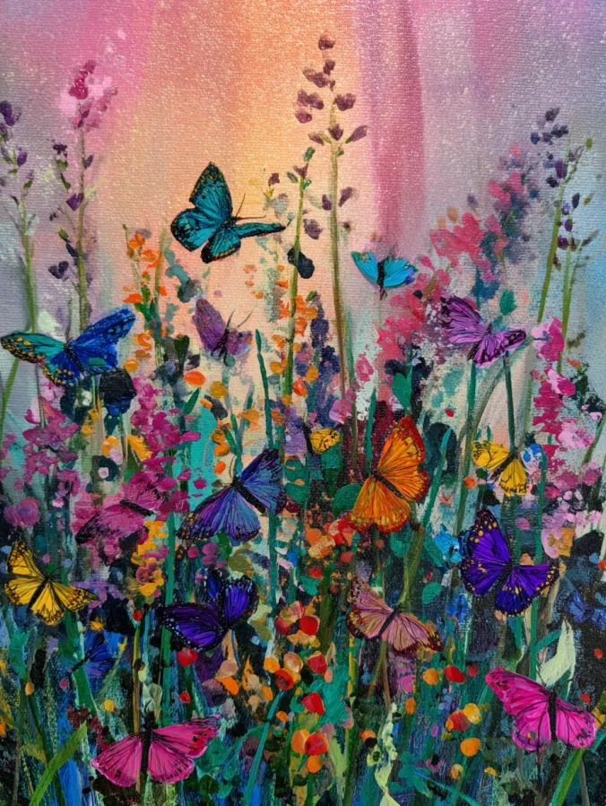 Painting a garden like this always feels joyful to me. I love how wildflowers allow me to paint freely without worrying about perfect shapes. Each flower and butterfly can have its own colors which keeps the process playful and creative. It is also relaxing because the scene builds naturally layer by layer with simple brush strokes. By the time the last butterfly is added the canvas feels bright, lively, and full of summer energy which makes it such a lovely painting to display.