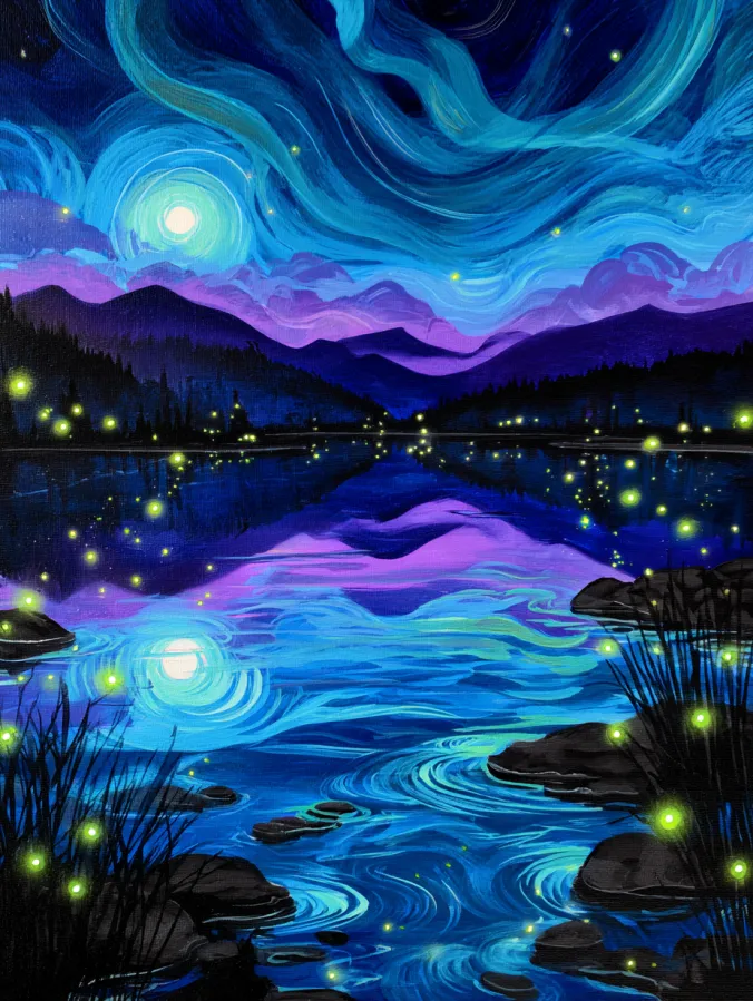 Painting something like this feels wonderfully calming. I love creating those swirling sky patterns because they feel expressive and loose. The glowing fireflies are my favorite part since each tiny dot of light instantly makes the scene feel alive. It is also relaxing to paint the reflections in the water since the brush strokes can stay soft and flowing. By the time the last little glow is added the whole painting feels dreamy and peaceful which makes it such a beautiful piece to hang in a cozy room.