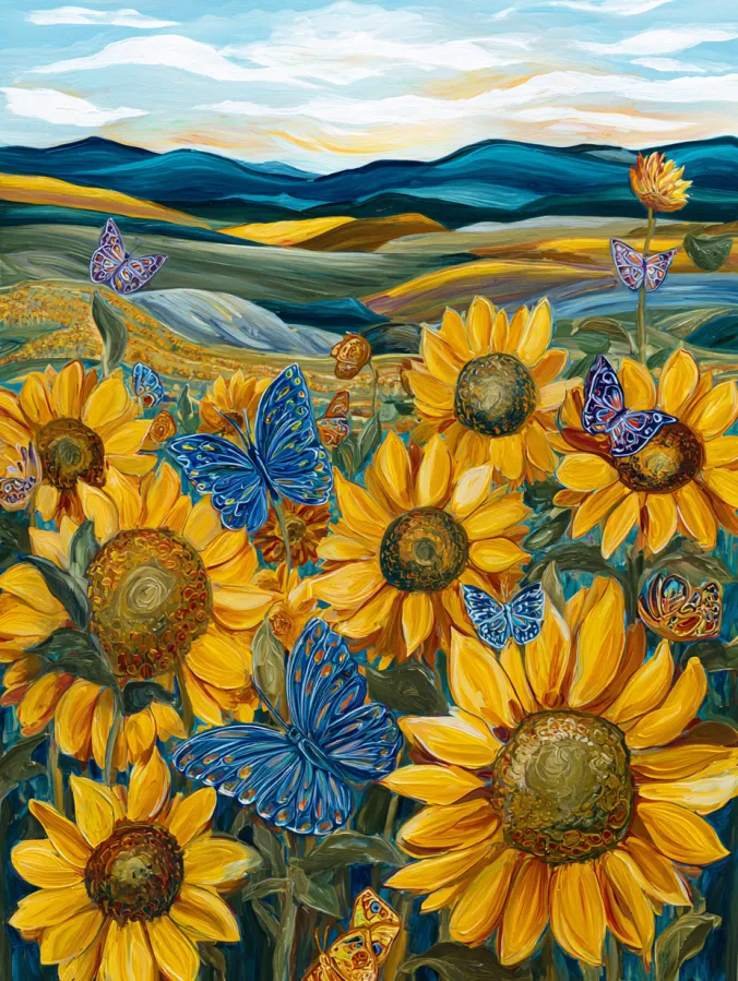 This acrylic painting bursts with warm golden sunflowers stretching across a rolling countryside. The flowers fill the foreground with big textured petals in bright yellows and soft amber tones. Their centers show rich earthy browns built up with thick swirling brush strokes. Several blue and violet butterflies flutter between the blooms and add playful pops of color against the warm flowers. In the background gentle hills sweep across the horizon in layered shades of teal, sage, and deep blue. A soft sky floats above with creamy clouds and pale sunlight washing over the landscape. The brushwork feels lively and expressive which gives the whole scene a cheerful energy.