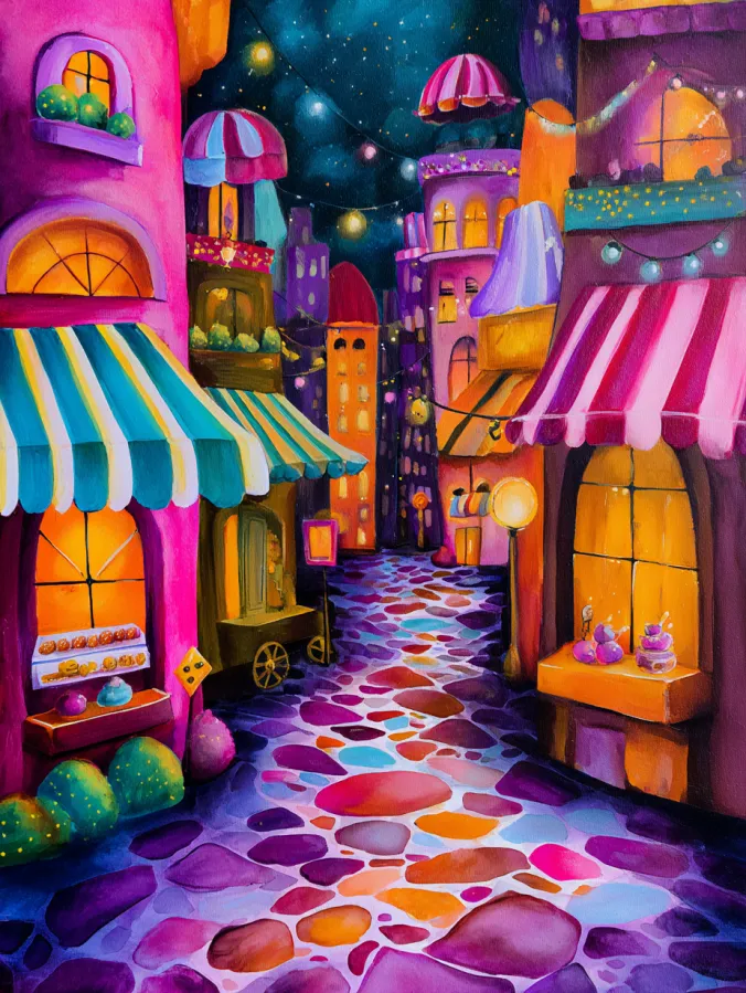 This acrylic painting shows a lively little street glowing under a deep night sky. Tall colorful buildings line both sides of a winding cobblestone path that leads through the center of the scene. Shop windows glow with warm golden light while striped awnings in pink, teal, and cream stretch above the storefronts. Strings of tiny lights hang across the street and sparkle against the dark sky. The cobblestone ground is painted in playful patches of purple, coral, blue, and orange which gives the street a cheerful mosaic look. Soft blended brush strokes and bold colors make the whole village feel cozy and full of life.
