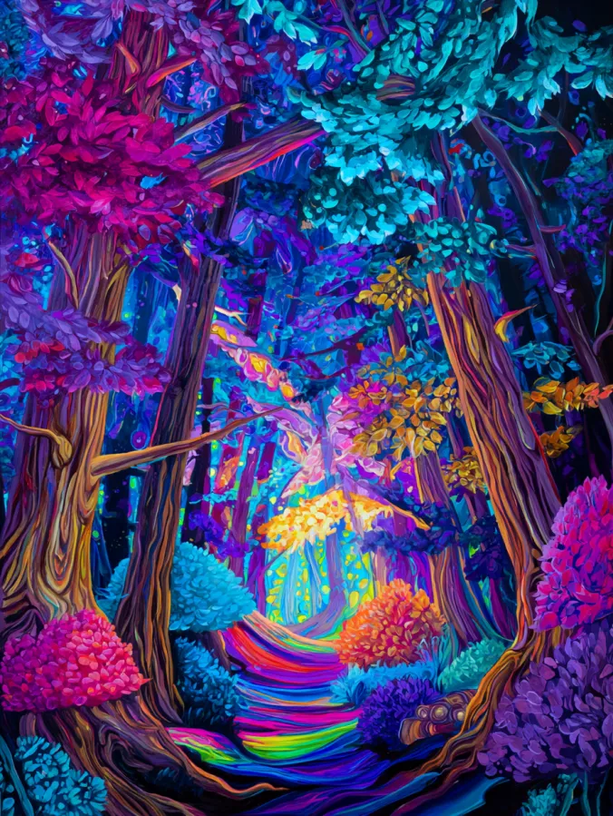 This acrylic painting shows a vibrant forest glowing with rich jewel toned colors. Tall trees stretch upward with twisting trunks in shades of deep violet, warm amber, and teal. Their leafy branches burst with pink, turquoise, and golden foliage that fills the canopy with color. A glowing path winds through the center of the forest in bright rainbow stripes that lead deeper into the scene. Soft light glows in the distance which adds a magical focal point at the heart of the forest. The brush strokes are bold and layered which gives the leaves and tree bark a textured storybook feel.