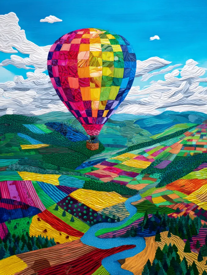 This acrylic painting shows a bright hot air balloon drifting peacefully above a landscape of colorful farmland. The balloon fills the sky with bold patchwork squares in shades of red, orange, yellow, green, blue, and pink. Below it the land stretches into rolling hills made up of patterned fields that look like a giant quilt. A winding river flows through the center of the valley and leads the eye deeper into the scene. Soft white clouds drift across a bright blue sky while the fields below shimmer with layered brush strokes and rich texture.