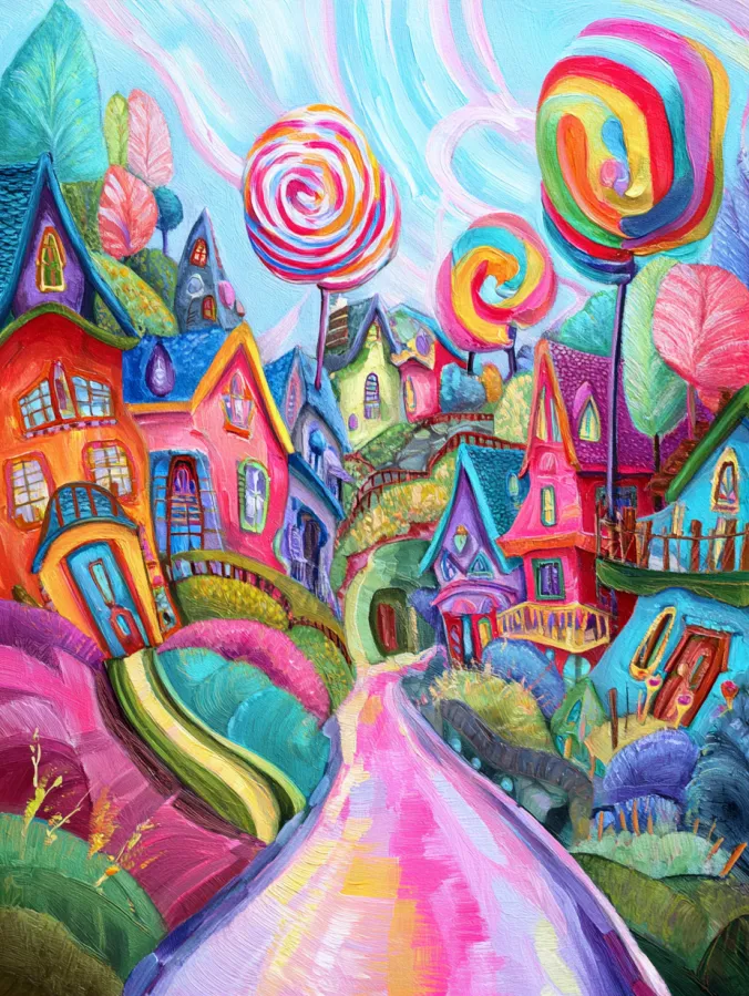 Painting something like this feels pure fun from start to finish. I love how the scene invites bold colors and playful imagination without needing to follow real world rules. Each house can have its own quirky style which makes the process feel creative and carefree. The giant lollipop trees are my favorite part because they instantly make the whole painting feel magical. By the time everything is finished the canvas feels like a cheerful little fantasy town that makes people smile the moment they see it.
