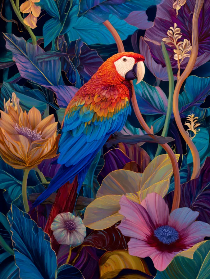 Painting something like this feels exciting and creative. I love working on tropical birds because their feathers invite bold color combinations and playful layering. The surrounding leaves and flowers give plenty of room to experiment with shapes and textures without needing perfect realism. It is relaxing to slowly build the scene by adding layers of foliage around the bird. By the time everything comes together the painting feels vibrant and full of life which makes it such a stunning piece to display.