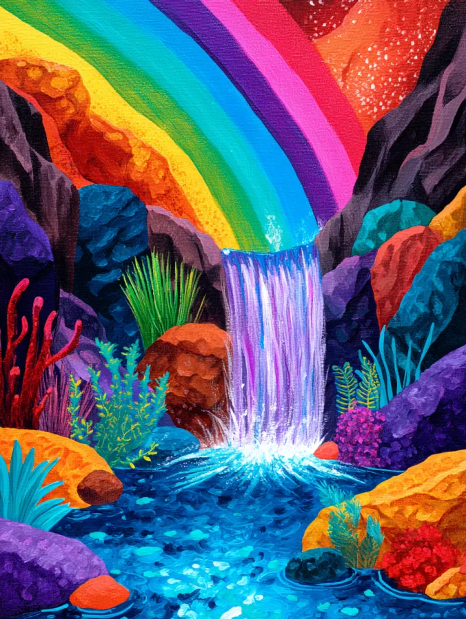 This acrylic painting shows a vibrant waterfall flowing through a canyon filled with bold color and playful shapes. A bright rainbow stretches across the sky above the falls and creates a glowing backdrop for the scene. The waterfall spills down into a sparkling blue pool surrounded by rocks painted in deep purple, coral, teal, and warm gold. Lush plants and coral like shapes grow along the edges of the water which add texture and lively detail. The brush strokes are thick and expressive which gives the water movement and makes the colors feel rich and energetic.