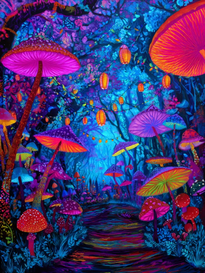 This acrylic painting shows a dreamy forest filled with oversized glowing mushrooms in every shade of pink, violet, orange, and teal. Tall mushroom caps stretch across the canvas while smaller spotted toadstools scatter along a winding forest path. Warm lantern lights hang between tree branches and cast a golden glow across the scene. The background fades into deep blue woodland shadows which makes the neon colors pop even more. Thick painterly brush strokes build texture on the mushroom caps and forest floor. The composition pulls your eye down the glowing path as if you could wander right into this magical woodland.